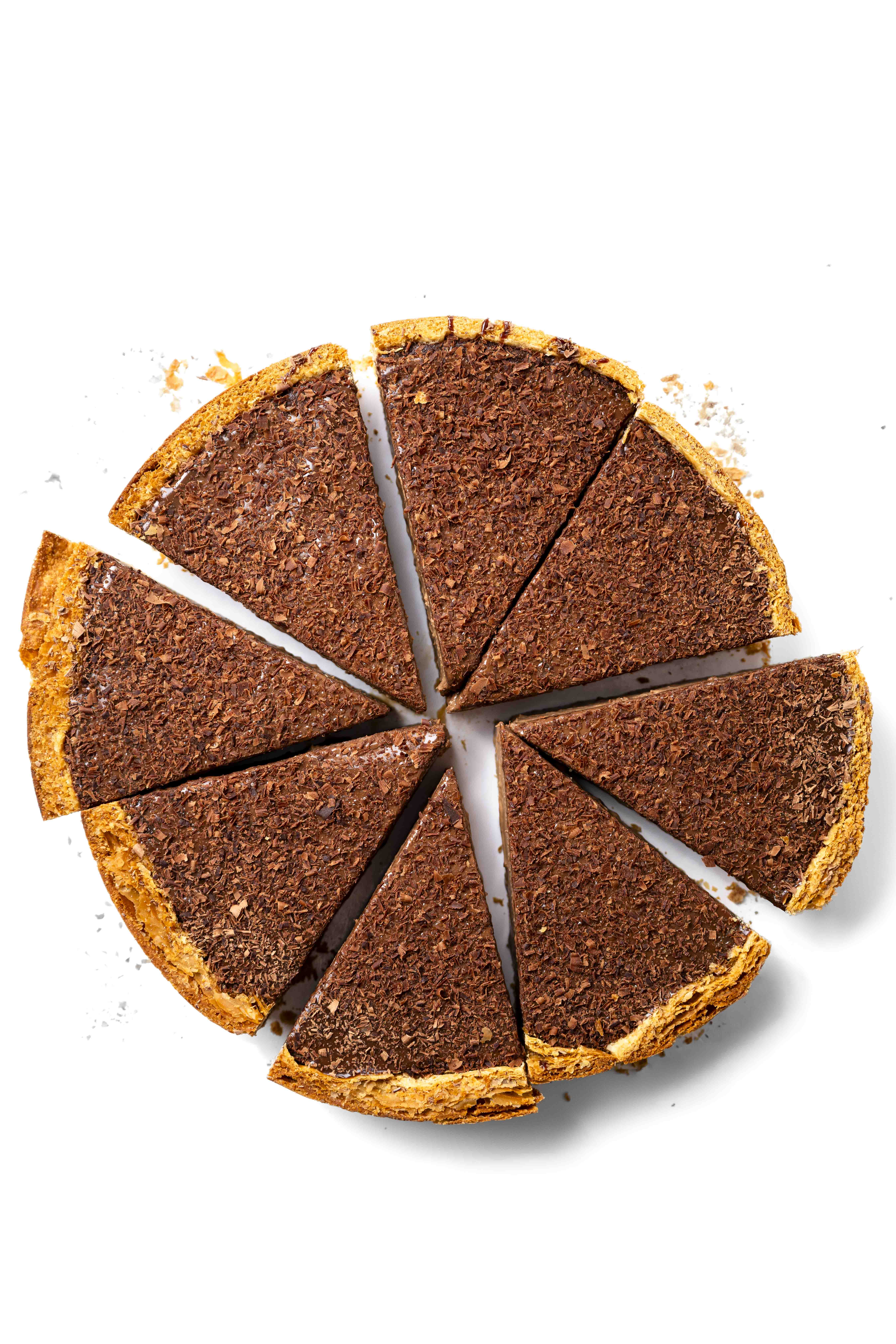 Pâte feuilletée, crème au chocolat 64 % À la Mère de Famille origine Madagascar, glaçage chocolat et petits copeaux de chocolat.